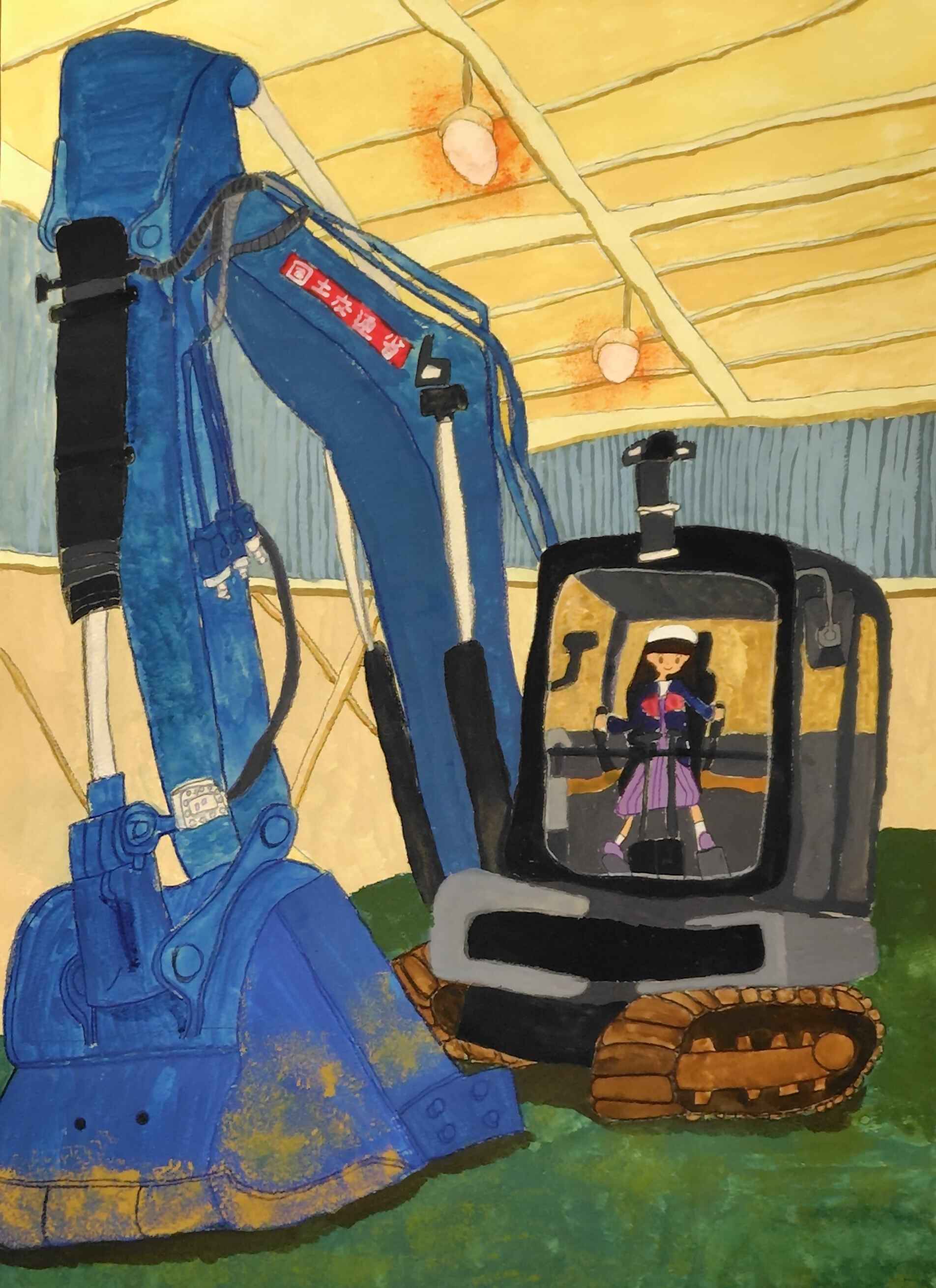 観光絵画展2025 観光協会会長賞「けんせつぎじゅつてんじかんの遠かくそう作しきバックホウ」
